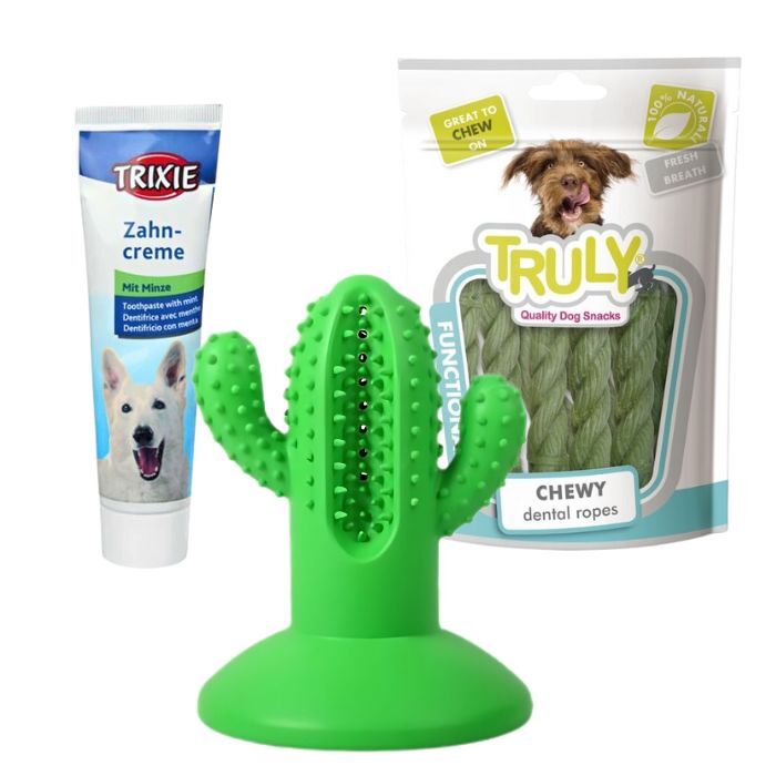 Giv din hund den bedste kombination af tandpleje, tyggeglæde og leg med dette komplette tandplejesæt! Pakketilbuddet indeholder Truly Dog Dental Ropes, en funktionel tyggegodbid der hjælper med at reducere plak og tandsten, Trixie Hundetandpasta med mint, som sikrer frisk ånde og sunde tænder, samt det innovative AFP Dental Cactus bidelegetøj, der både renser tænderne mekanisk og holder din hund beskæftiget i lang tid.