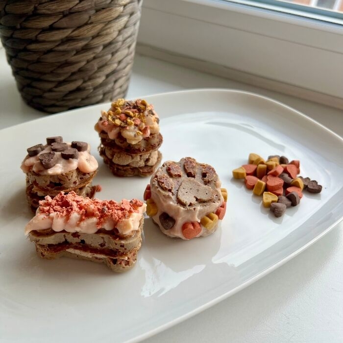 • Vi brugte Tubidog Vådfoder til at samle 2 kager, og Wanpy Vådfoder som "hundeglasur"