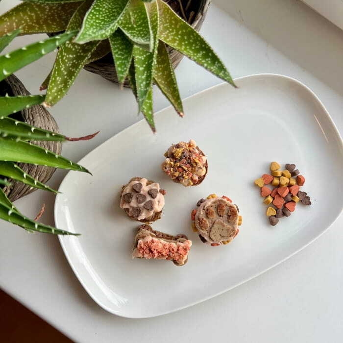 Du får alt i én pakke: en smart bageform, velsmagende vådfoder til fyld og pynt, og godbidder til topping eller som belønning.