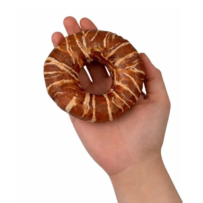 Donut with Chicken & Cod er en indbydende tyggegodbid, der kombinerer råhud med smagfuld kylling og torsk. Den ringformede snack giver din hund en anderledes tyggeoplevelse, hvor både tekstur og smag er i fokus. Formen gør den nem for hunden at holde fast i med poterne, mens den tygger.