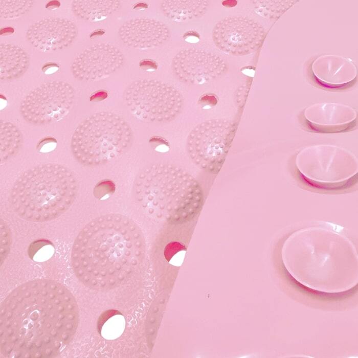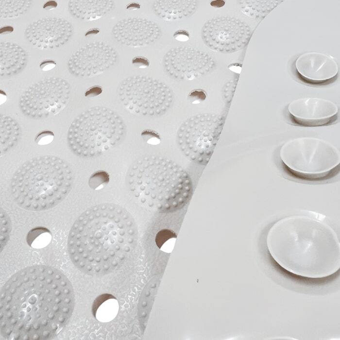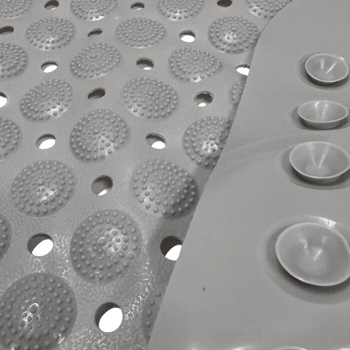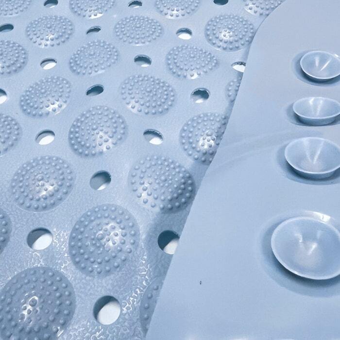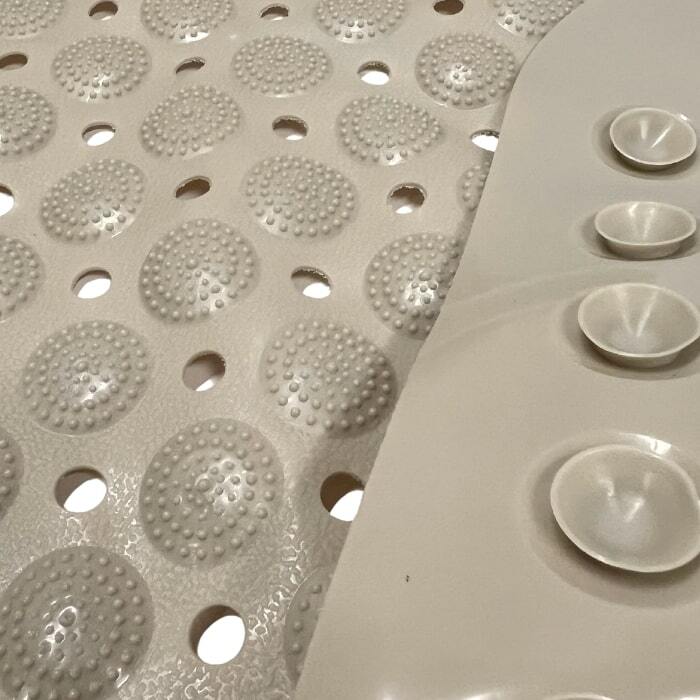 Bademåtten har sugekopper under og et præget mønster på oversiden, som gør måtten særdeles skridsikker.