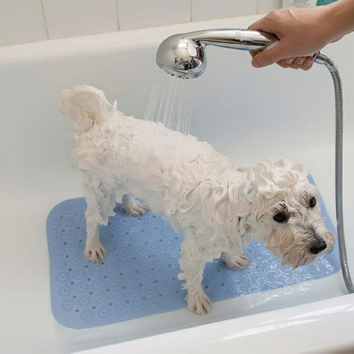 Flot, skridsikker bademåtte i flotte farvet gummi - så kan vovsen stå fast i badekarret