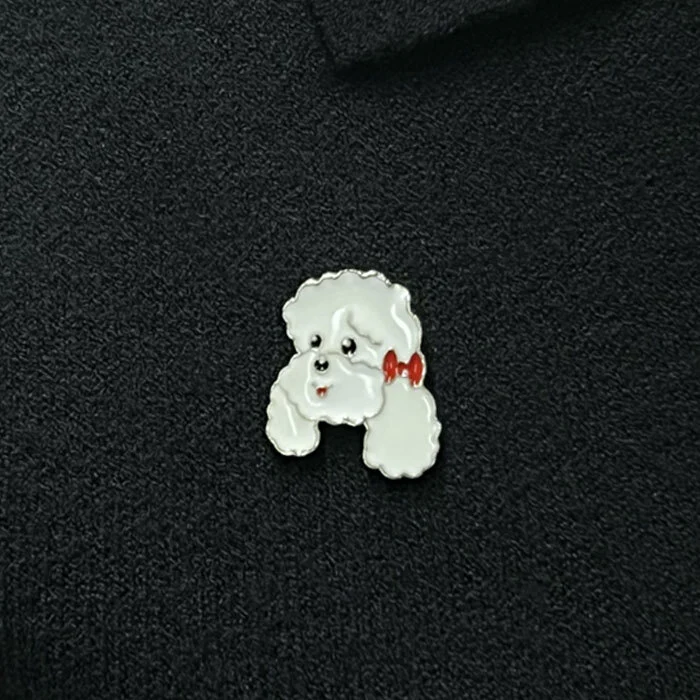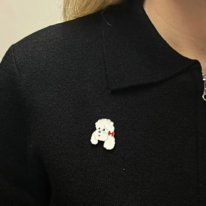 Med denne Ollipet Badge får du en dekorativ og personlig detalje, der viser din kærlighed til hunde på en stilfuld måde. Badgen forestiller en nuttet hvid puddellignende hund med finde detaljer, bløde former og en rød sløjfe. Det blanke look kombineret med de sølvfarvede kanter skaber et iøjnefaldende design.