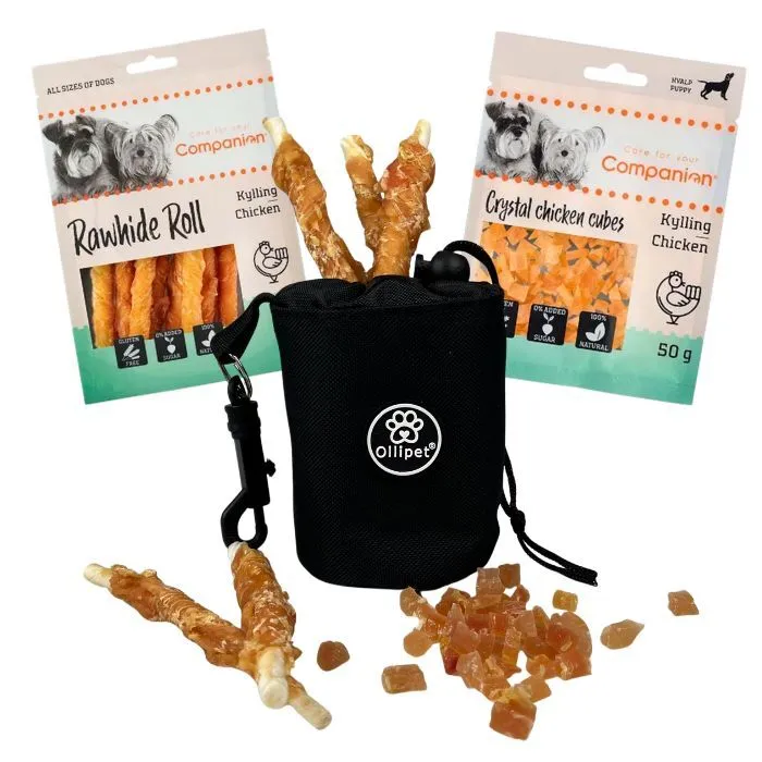 Den perfekte trænings- og gåturspakke med praktisk godbidstaske og lækre kyllingesnacks til din hund.