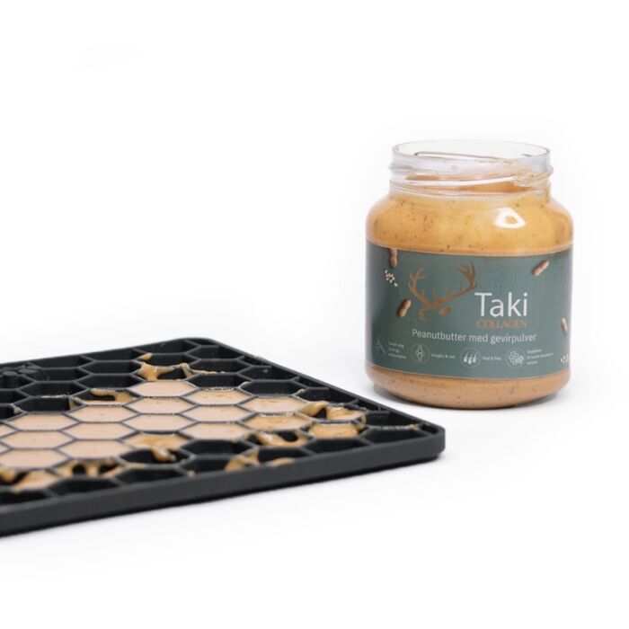 Med Taki Collagen Peanutbutter vil du kunne kombinere en sjovt og stimulerende aktivitet for din hund med en sund og næringsrig kost. Peanutbutteren er hovedsageligt lavet af ristede jordnødder, hvilket er en god kilde til protein og energi for hunden. Derudover indeholder den masser af sund fedt. Smagen af jordnødder er ofte et hit hos hunde, så derfor kan vi varmt anbefale at inddrage det i deres aktiviteter!