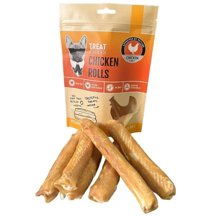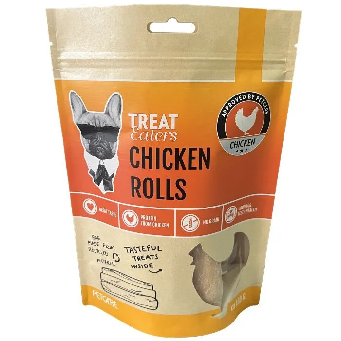 Treateaters Chicken Rolls er kornfrie tyggeruller med kylling, der giver din hund en lækker og langvarig tyggeoplevelse.