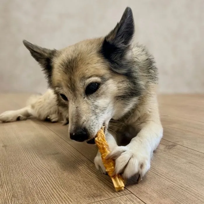 Tyggepindene er lavet af råhud betrukket med velsmagende kylling, som lokker hunden til at tygge endnu mere.