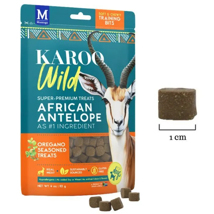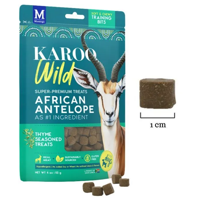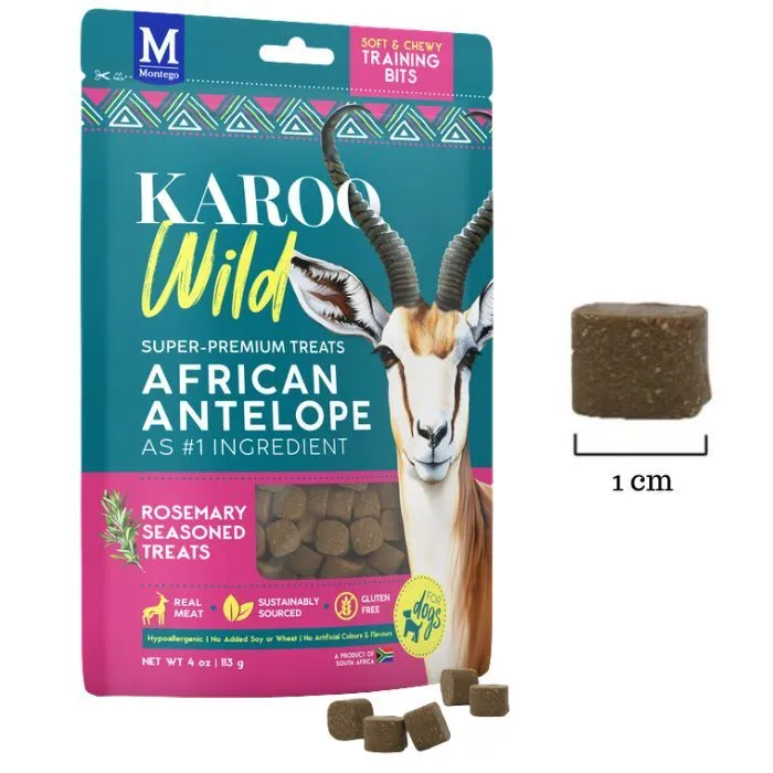 KAROO Wild Training Bites er små, kornfrie træningsgodbidder på ca. 1 cm, fremstillet af antilopekød og tilsat forskellige krydderyrter. Super premium hundesnacks med højt proteinindhold og fedtfattig opskrift baseret på magert kød – uden kunstige farve- eller smagstoffer.