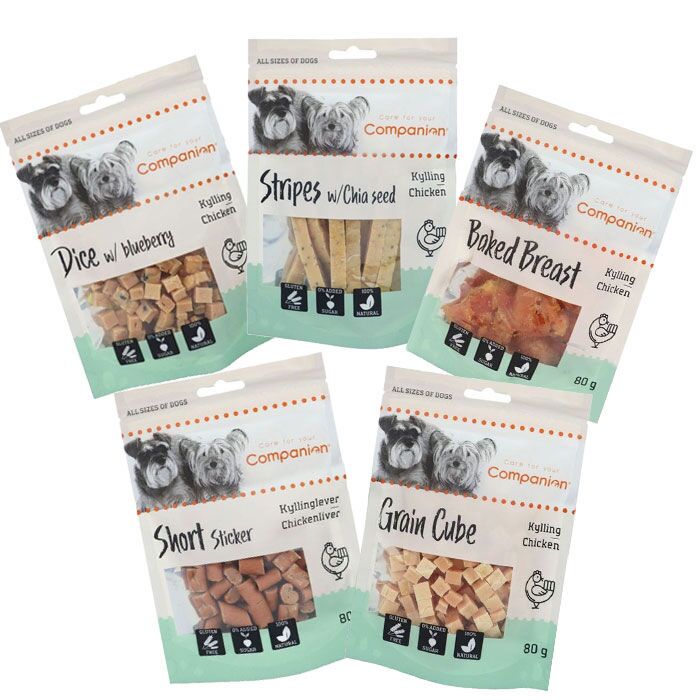• Indeholder 5 forskellige poser Companion godbidder (80g pr.pose)