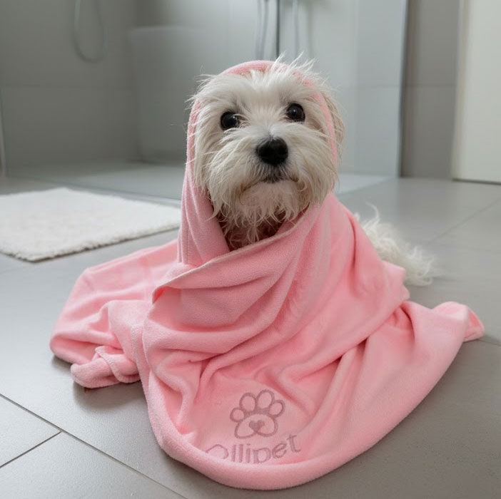 Med dette store supersugende og hurtigtørrende microfiber-håndklæde fra Ollipet har du det perfekte håndklæde til at tørre din hund efter en tur i badet. Ollipet håndklædet er også en god sikkerhedsforanstaltning, hvis I kommer hjem efter en rigtig våd og beskidt gåtur.