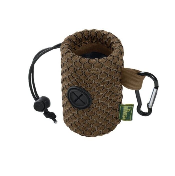 Høm Høm Poseholder Hunter Hilo har flere fine detaljer. En karabinhage i toppen kan fæstnes til bukselomme eller jakken. Midt på tasken er et hul hvor der nemt og hurtigt kan trækkes en hundepose ud når behovet opstår. Poseholderen kan spændes ind i toppen så poserne holdes på plads. Poseholderen er fremstillet i blødt mesh materiale.