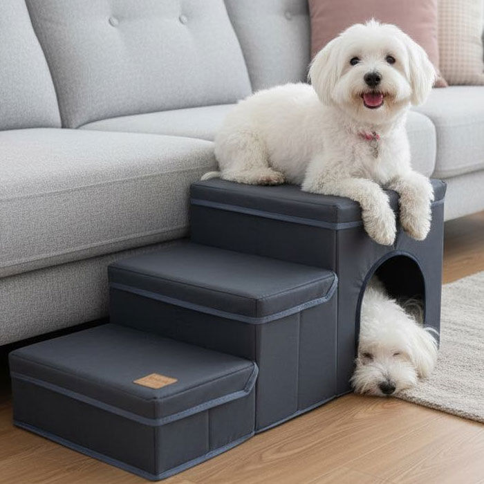 Trinene er mere end blot en praktisk tilføjelse; de har et vandafvisende betræk, der sikrer holdbarhed og let vedligeholdelse. Det innovative design inkluderer de to nederste trin som opbevaringsrum, hvilket giver en pæn løsning til at organisere kæledyrstilbehør eller legetøj.