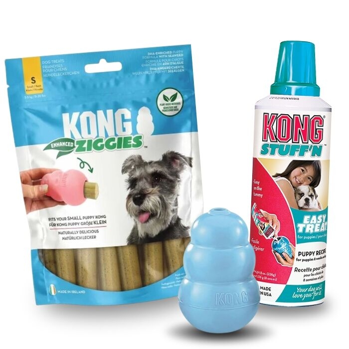 Med KONG Puppy Aktiveringssættet får du en samlet pakke med produkter, der er designet til at passe perfekt sammen. Sættet kombinerer det ikoniske KONG Original Puppy legetøj med lækre KONG tyggeben og velsmagende lever pasta til hvalpe. Sammen skaber de en optimal løsning til aktivering, mental stimulering og belønning i hvalpens første vigtige måneder. Kong legetøjet kan fyldes op med den velsmagende Stuff´n Leverpasta, hvorefter hvalpen kan bruge lang tid på at slikke indholdet ud. De medfølgende Ziggies Enhanced tyggeben passer også perfekt ned i KONG hvalpelegetøjet.
