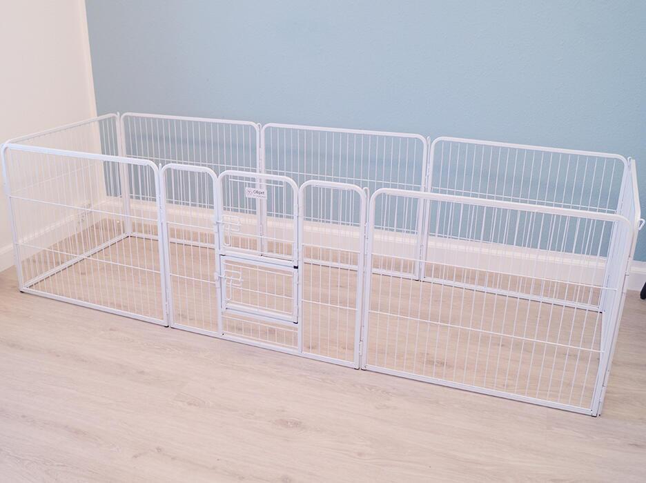 Yderst solid og stabil hvalpegård til hunde op til cirka 6 kilo. Hvalpegården er utrolig rummelig, og består af 8 fag, der kan kombineres som du vil. På billedet vises kvadratisk opstilling, hvilket giver en hvalpegård, der måler 140 x 140 centimeter. Du kan dog opstille den som du vil og eventuelt kombinere to hvalpegårde til een stor konstruktion. Vi anbefaler dog, at du i så fald får den afstivet eller opstillet så vægge eller lignende kan støtte den.