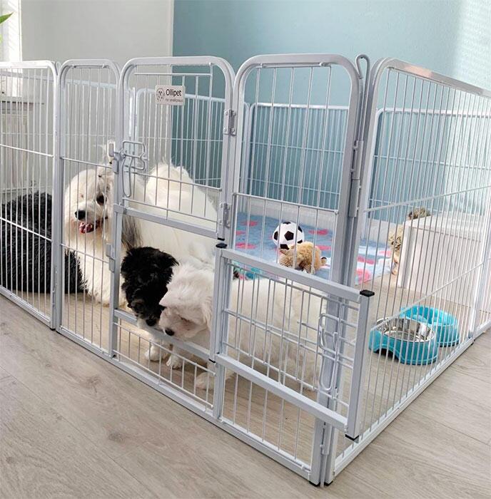 Hvid, kraftig og rummelig hvalpegård fra Ollipet med 2 delt låge - 140 x 140 cm som vist