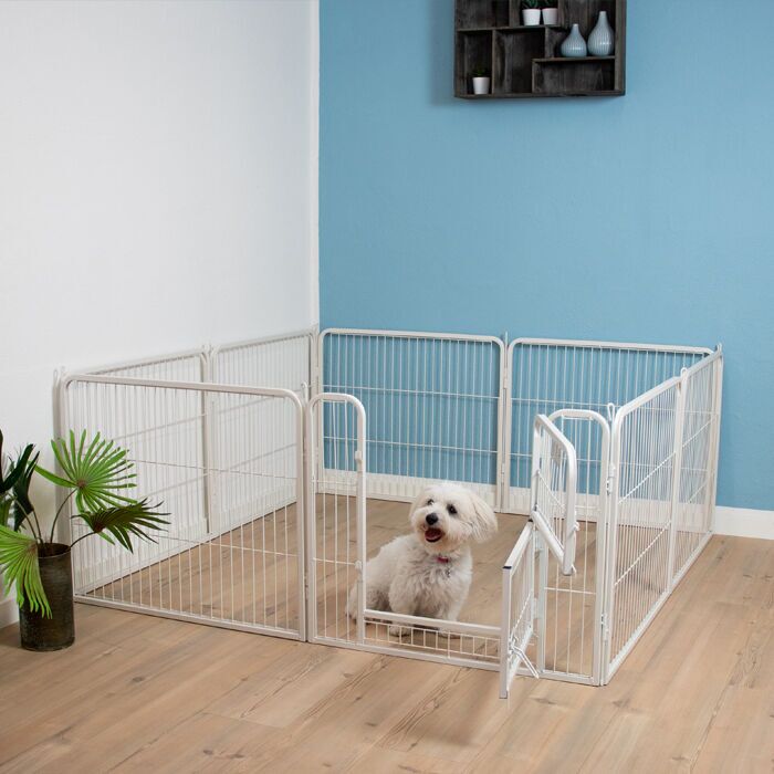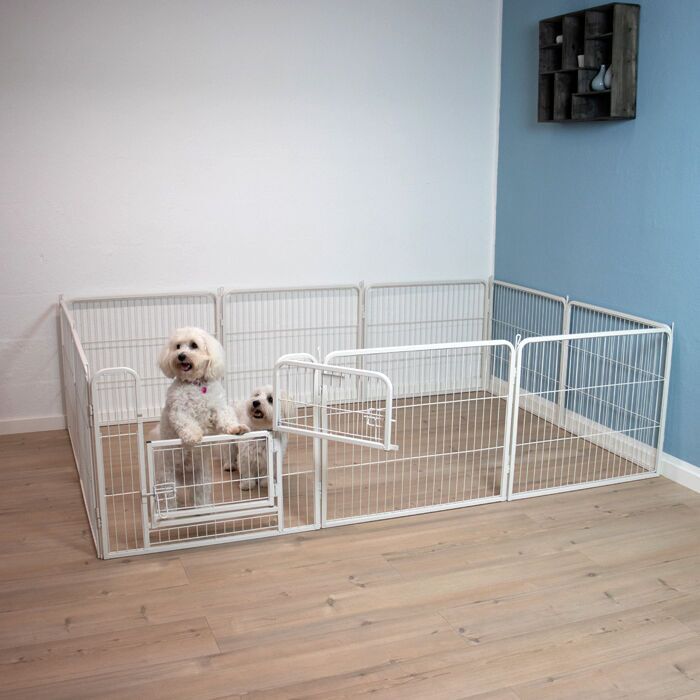 Mio er en hvid, kraftig og rummelig hvalpegård fra Ollipet med 2 delt låge - 140 x 140 cm opstillet som vist - hvert fag måler 71cm i bredden og 61cm i højden