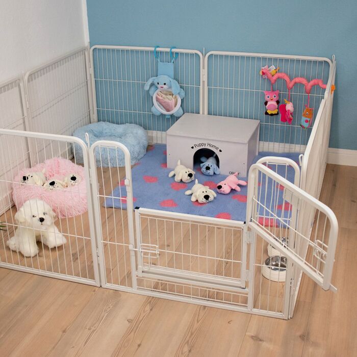Indret hvalpenes hjem i hvalpegården, hvor de skal vokse op de første 8 uger. Du kan trygt lad dem lege og sove i hvalpegården, men vi anbefaler at du lægger et skridsikkert vetbedtæppe samt renlighedsunderlag i bunden af hvalpegården, så hvalpene har et blødt underlag og et sted, hvor der kan tisses.