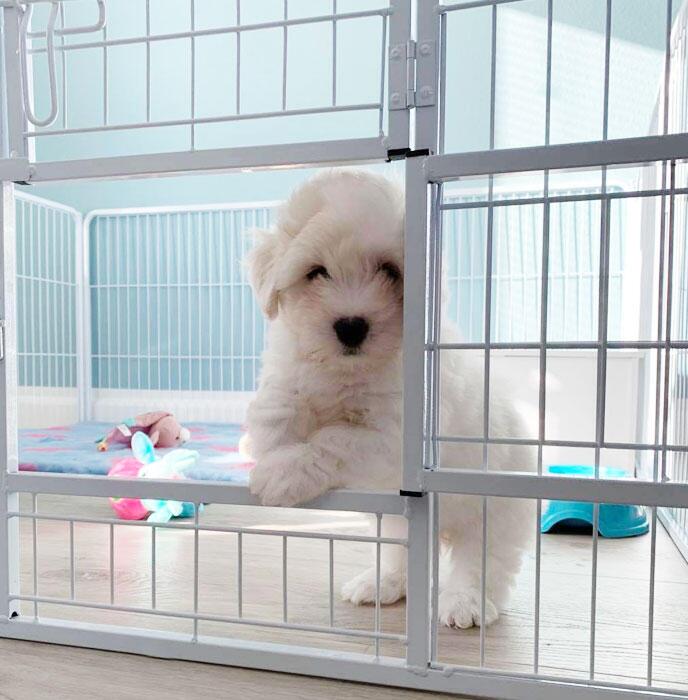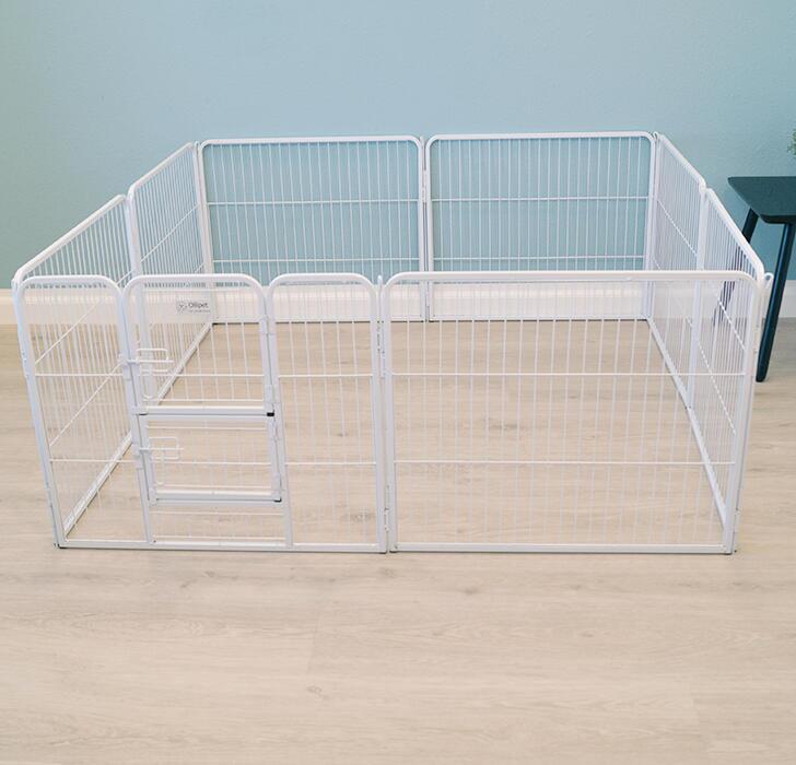 Ollipet “Mio” er en hvid, kraftig og rummelig hvalpegård med 2 delt låge - 140 x 140 cm som vist DEMOMODEL MED ENKELTE BRUGSTEGN