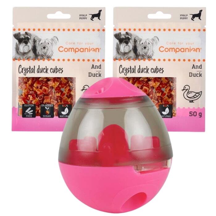 Hvalpe aktivitets æg m. godbidder er det ideelle sæt til dig, der vil give din hvalp en sjov og mental udfordring. Sættet kombinerer Ollipets vippebaserede aktivitetsæg med en pose bløde Companion Mini Duck Cubes – perfekte til nysgerrige snuder og små munde. Aktivitetsægget er designet til at stimulere din hvalps sanser, intelligens og motorik, mens godbidderne sikrer, at belønningen er både lækker. Aktivitetsægget vipper op igen, når hvalpen puffer til det, og gør dermed legen vedvarende og engagerende. Det kan også bruges som slow-feeder og er perfekt til at skabe ro og fokuseret aktivitet i dagligdagen.
