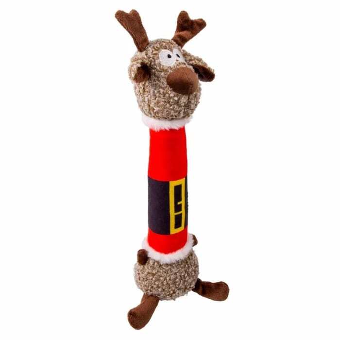 Gør klar til julesjov med KONG Holiday Shakers Luvs Reindeer – et festligt og farverigt legetøj, der kombinerer leg, lyd og hygge i ét! Dette søde rensdyr er iført julemandsdragt og har en lang, fleksibel krop, som gør den ideel til ruskeleg. Den indbyggede squeaker piver lystigt, når din hund bider i bamsen, og holder dermed interessen fanget i timevis. Det sjove design og den bløde overflade gør den lige så god som krammebamse som til aktiv leg – en perfekt julegave til din firbenede ven.