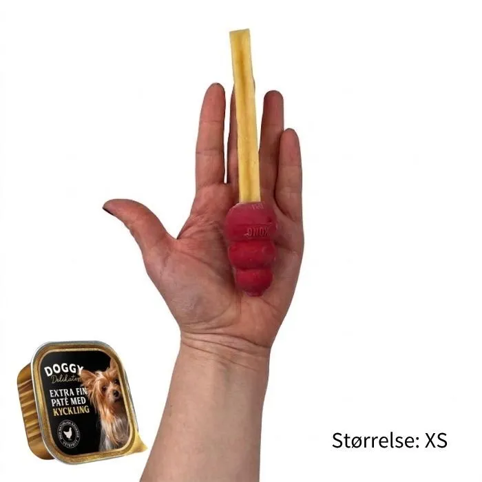 - Kombinerer legetøj, tyggeben og vådfoder i én pakke