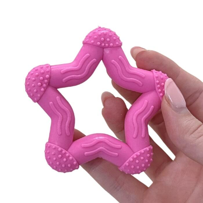 Bring farve og sjov ind i din hunds hverdag med Ollipet ColorPops | Stella Star bidering – et legende og dekorativt tilbehør designet til nysgerrige hunde med sans for sjove former. Den karakteristiske stjerneform med hul i midten gør det let for små hunde at håndtere ringen, mens den bløde og fleksible overflade er behagelig at have i munden. De små forhøjninger langs kanten giver ekstra sanseindtryk, som bidrager til mental stimulering under leg.