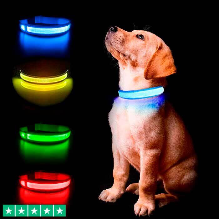 Supersmart kraftigt lysende LED-halsbånd af nylon med reflekterende stribe og ring af optisk LED-lys hele vejen rundt.