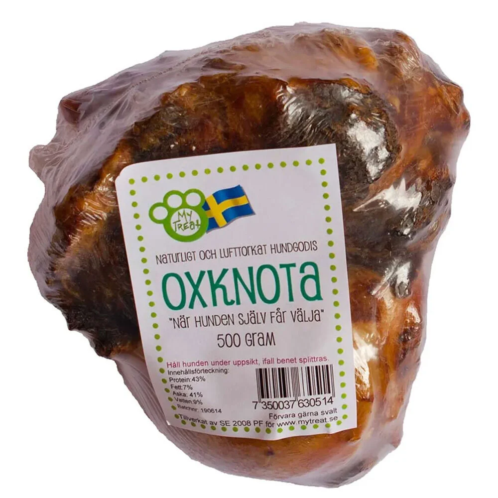 My Treat Oxknota er en naturlig og lufttørret hofteknogle fra okse produceret i Sverige. En solid tyggeartikel med lang tyggetid til hunde, der elsker naturlige snacks.