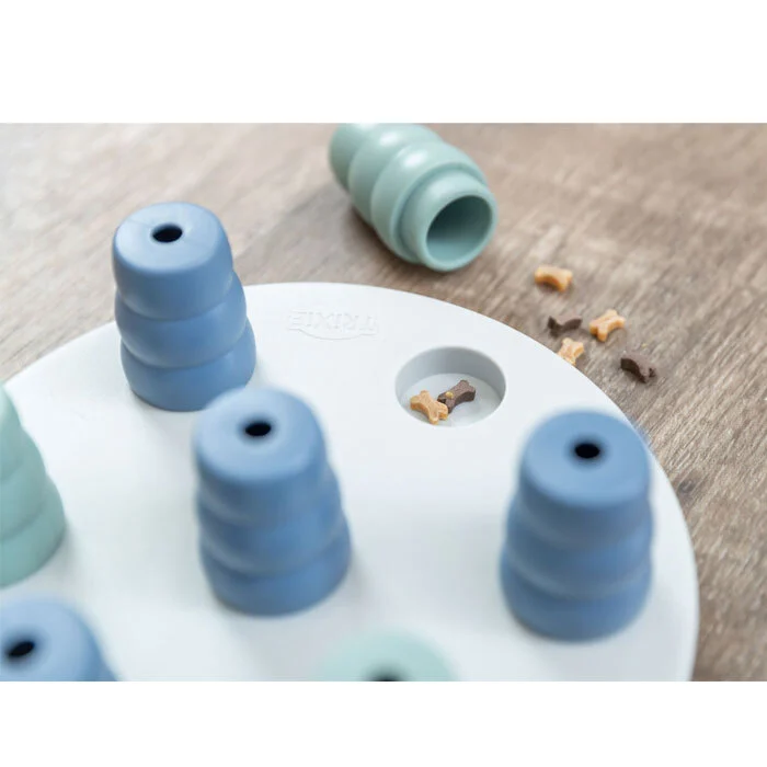 Spillet består af en rund spilleplade med syv kegler. Under hver kegle kan du gemme godbidder eller tørfoder. Herefter skal hunden finde ud af, hvordan den får flyttet keglerne for at blive belønnet med godbidderne, du har lagt i.
