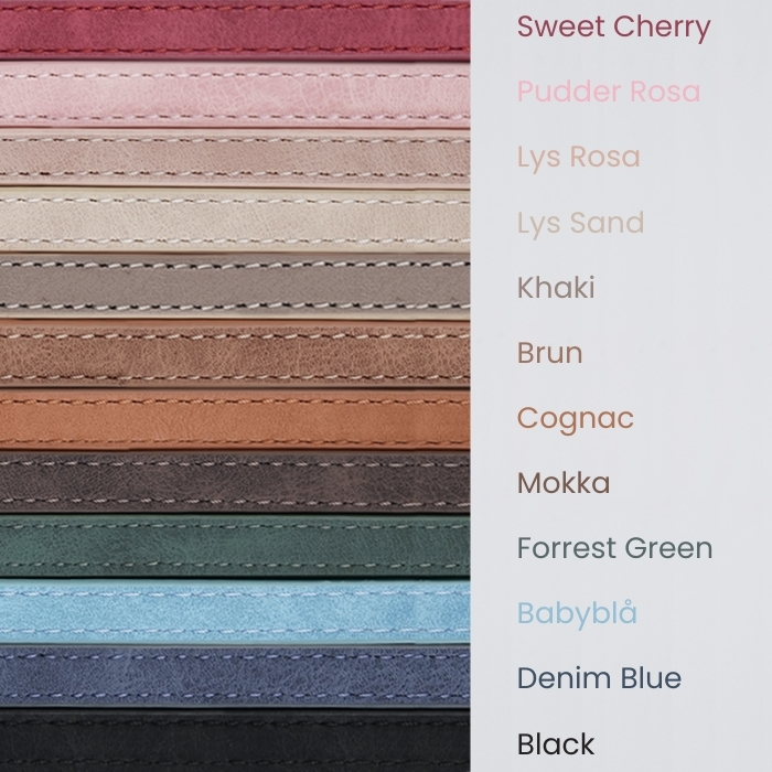 - Farve: Sweet Cherry, Pudder Rosa, Lys Rosa, Lys Sand, Khaki, Brun, Cognac, Mokka, Forest Green, Babyblå, Denim Blue, Sort