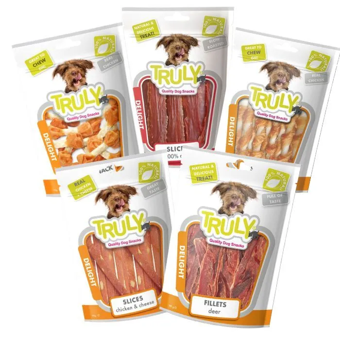 Forkæl din hund med et varieret pakketilbud fra Truly Delight med 5 forskellige poser fedtfattige hundesnacks. Her får du et udvalg af smagsvarianter og former – alle med et fedtindhold under 4%.