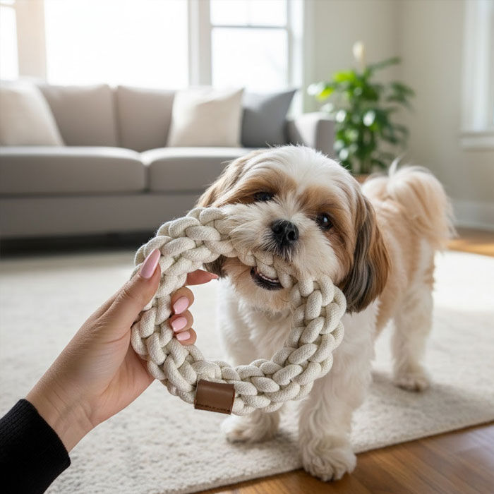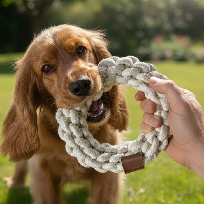 Giv din hund timevis af underholdning med Pawise Premium Legetøj af Bomuld | Ring, et slidstærkt tygge- og kastelegetøj fremstillet af flettet bomuldsreb. Det kraftige bomuldsmateriale gør legetøjet ideelt til både leg, tygning og træklege, og den cirkelformede ring giver et solidt greb for både hund og ejer. Uanset om din hund elsker at tygge, hente eller tumle, er denne ring skabt til at holde til selv de mest ivrige legekammerater.