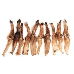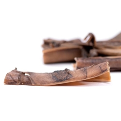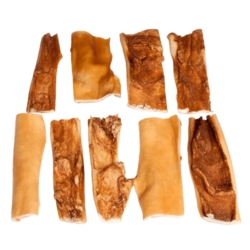 - Snoet torskeskind: Disse stænger er lavet af snoet torskeskind og er fyldt med MUMS og sundhed. På grund af snoningen er torskeskindet relativt sejt at bide i, hvilket er med til at give en god tyggetid. Torskeskind er fyldt med proteiner, hvilket gør dem velegnet til aktive hunde og hunde med allergi.