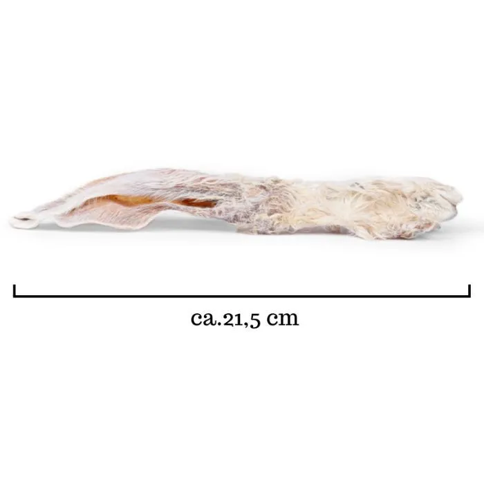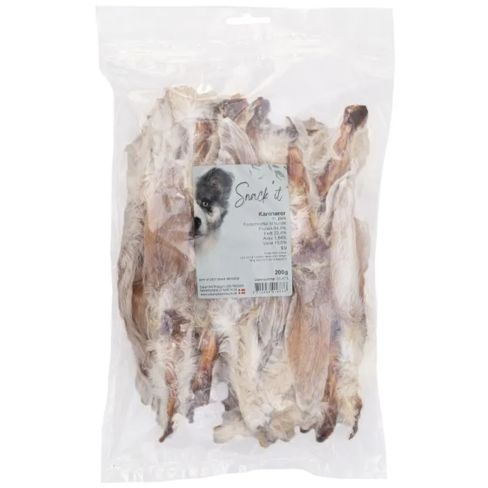 Snack'it tørrede kaninører med pels! Disse 100% naturlige snacks er sunde og gode og bidrager med gode egenskaber for hundens fordøjelse. Kaninøre med pels en delikatesse for hunde, og pelsen bidrager med en positiv "rensende" effekt i deres system, hvilket hjælper med at opretholde en sund mavebalance.