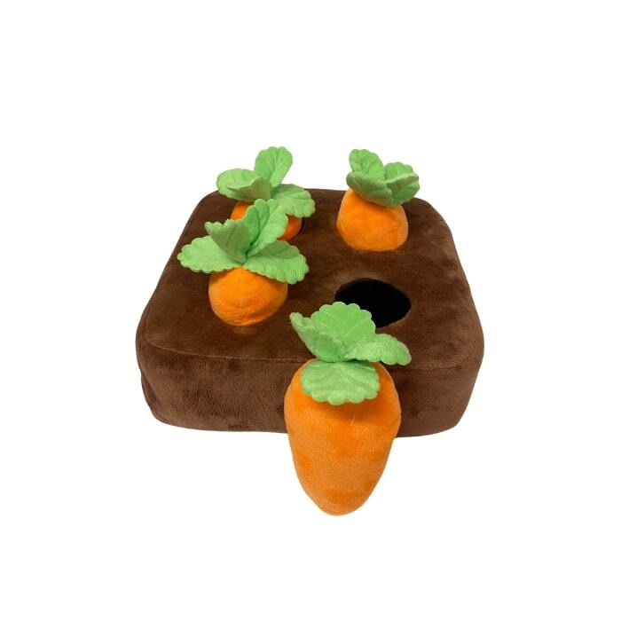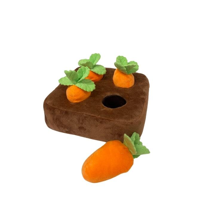 De fire aftagelige gulerødder med pibelyd fungerer som små udfordringer, hvor du kan gemme godbidder eller foder. Hunden får lov at bruge sin naturlige søgeinstinkt, snude og hjerne — og du får en gladere, mere tilfreds hund. Win-win, darling.