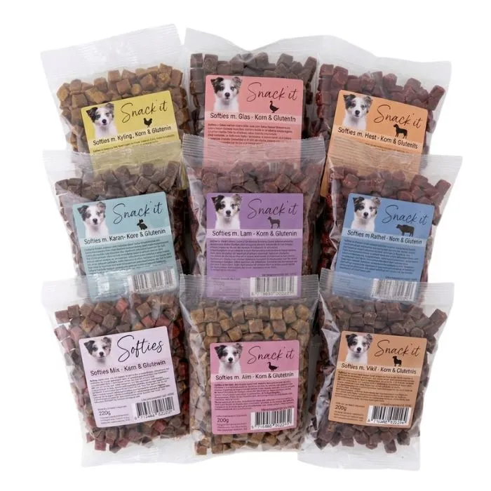 Med dette pakketilbud får du en nøje sammensat pakke med 9 poser Snack'it Softies i udvalgte varianter. Her er variationen allerede tænkt for dig, så du nemt kan tilbyde din hund forskellige smagsoplevelser – uden selv at skulle vælge.