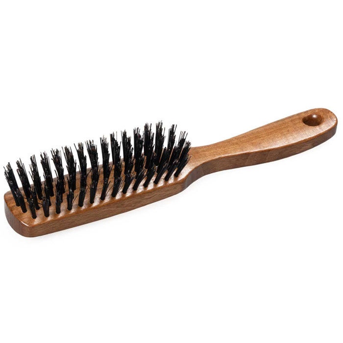 Klassisk træbørste med stærke svinebørster, der løsner filtre og mindsker statisk pels.