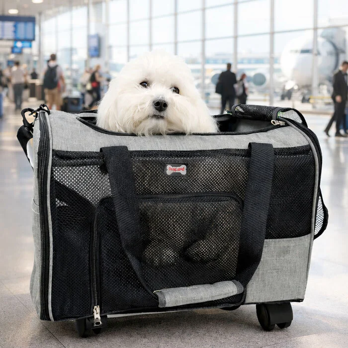Fleksibel rejsetaske fra DogLemi med skulderstrop, bærehåndtag og fire hjul – Ideel til let og komfortabel transport af dit kæledyr