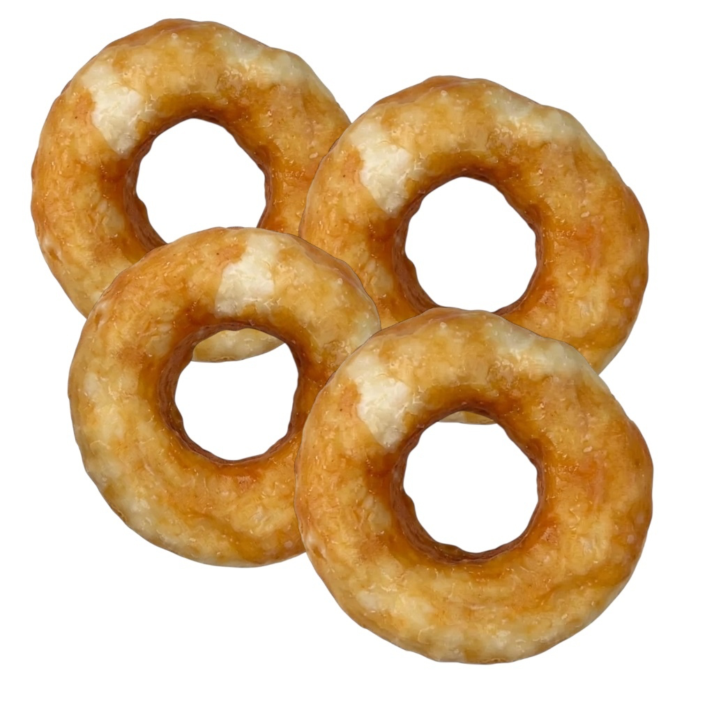 Donutformen gør tyggebenet nemt for hunden at holde og arbejde med, uanset størrelse. Den kompakte form kombineret med den seje konsistens gør det oplagt til både små og mellemstore hunde, mens større hunde også kan få glæde af tygget som en velsmagende snack og aktivering.