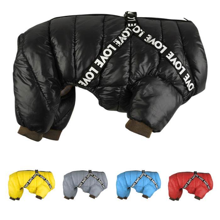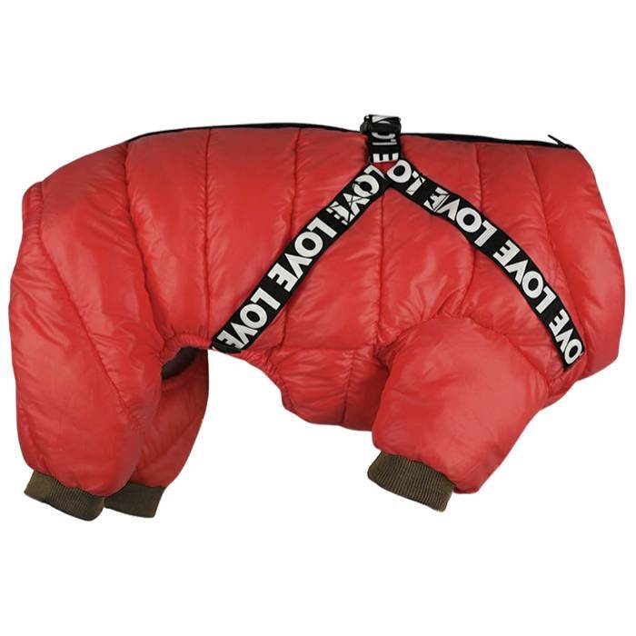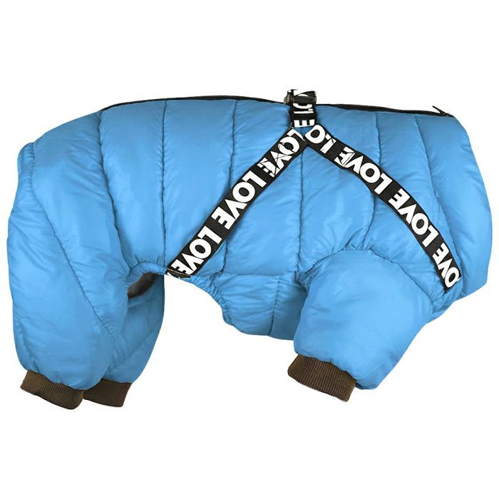 LOVE Flyverdragt med integreret sele. Hold hunden varm med denne brugervenlige kombination af flyverdragt og sele.